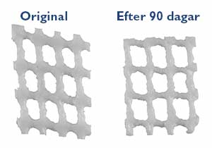 Efter 90 dagar, under observerad kompostering, är det tydligt att en stor del av materialet har försvunnit. Till vänster är en originalbit av X-LITE® och till höger samma storlek efter 90 dagar kompostering.